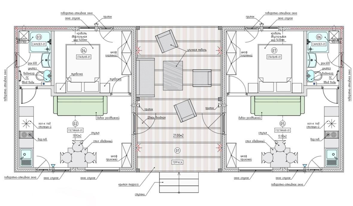Планировка - по 2 двухмодульных дома и терраса посередине. Такие вот интересные дуплексы)