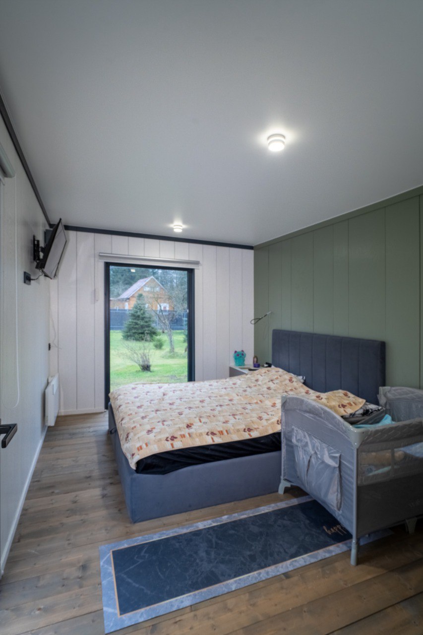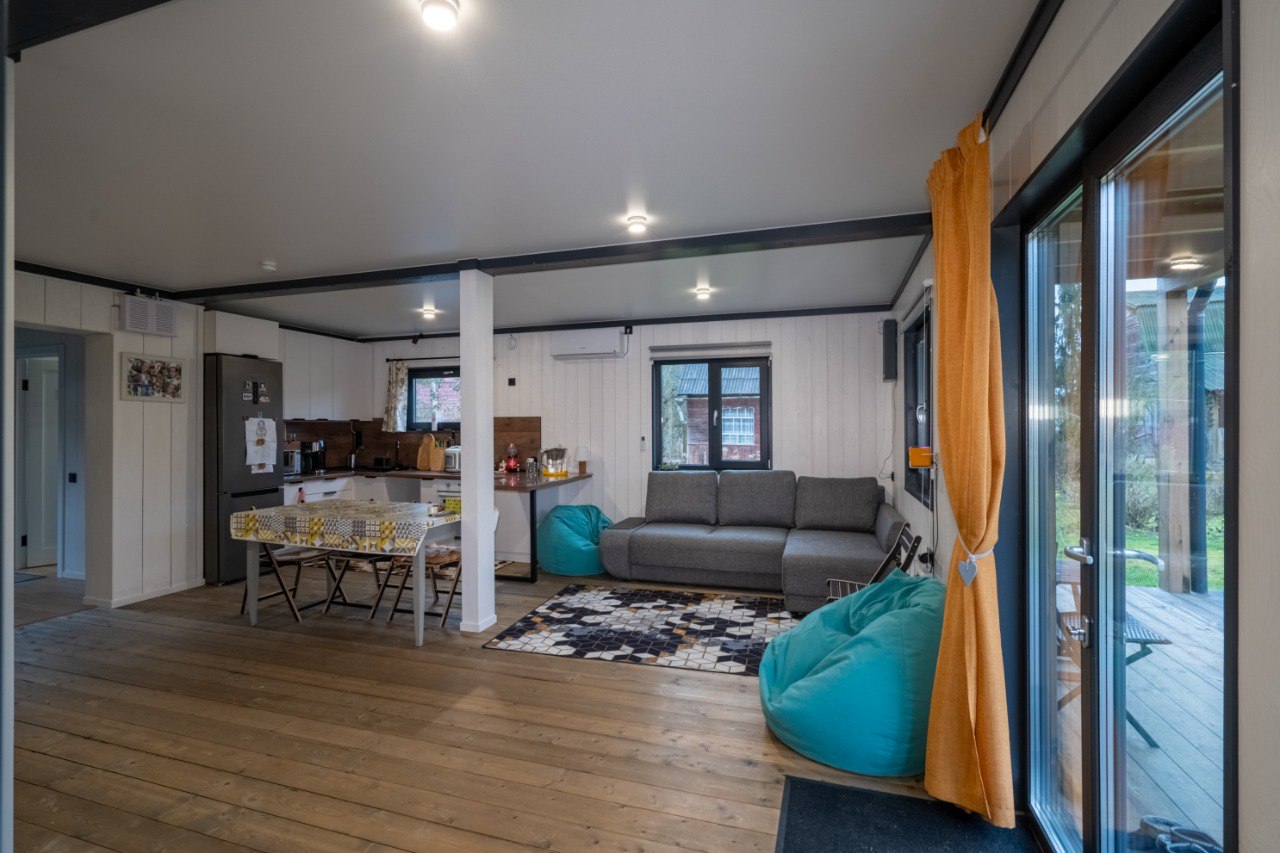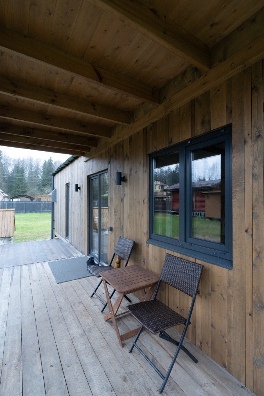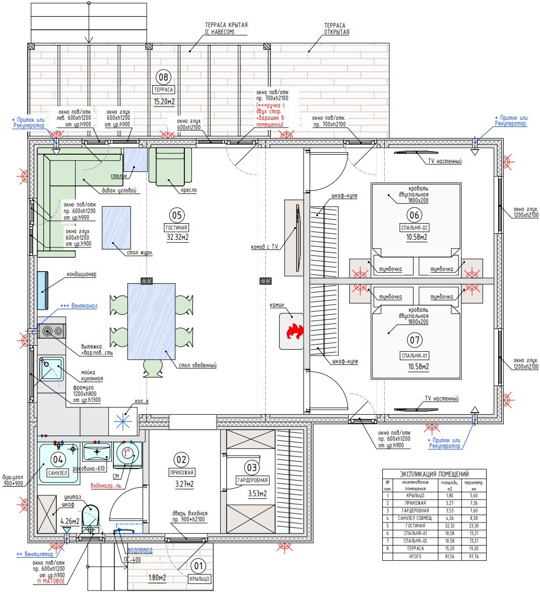 В самой планировке из основных плюсов, на наш взгляд, это наличие гардеробной в прихожей! 2 полноценных спальни и большая кухня-гостиная с камином. Достаточно практичное распределение пространства для небольшой семьи